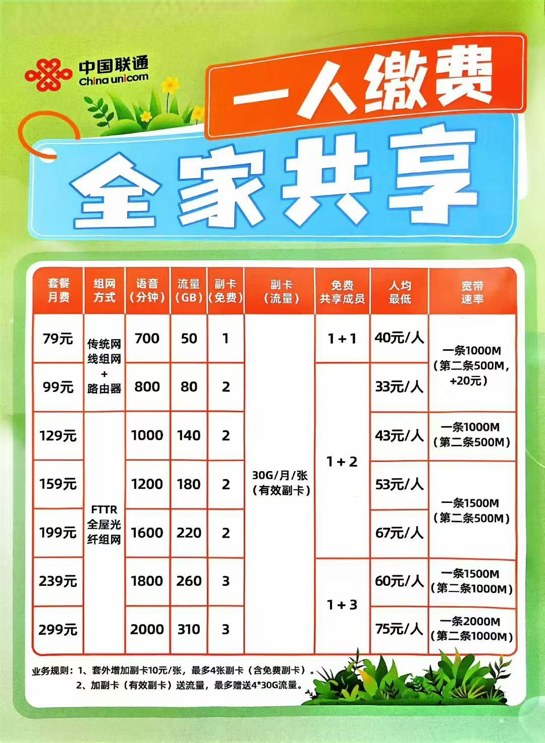 中国联通2025年11月陕西联通宽带套餐资费 西安市免费上门办理宽带安装携号转网 一、联通宽带套餐资费详情 新开/携转79元套餐:含2张副卡,宽带500兆,流量80GB,通话700分钟。 - 新开/携转89元套餐:含2张副卡,宽带500兆,流量100GB,通话600分钟。 - 新开/携转99元套餐:含2张副卡,宽带500兆,流量1400GB,通话700分钟,含1路IPTV 。 二,西安联通宽带FTTR全屋光纤套餐 - 129元套餐:宽带1000M,通话800分钟,流量120GB,含IPTV。 - 159元套餐:宽带1000M,通话1200分钟,流量150GB,含IPTV。 - 199元套餐:宽带1000M,通话1600分钟,流量200GB,含IPTV。 西安联通宽带办理中心提供免费上门办理 预约热线15991663619 携号转网 宽带安装